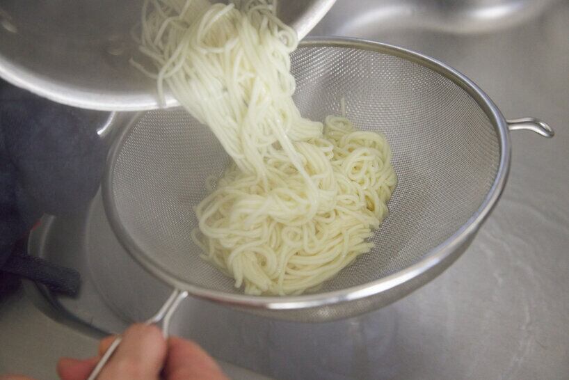 ④茹で上がった麺をザルにあげてよく湯切りし、スープの入った丼ぶりに入れてください。